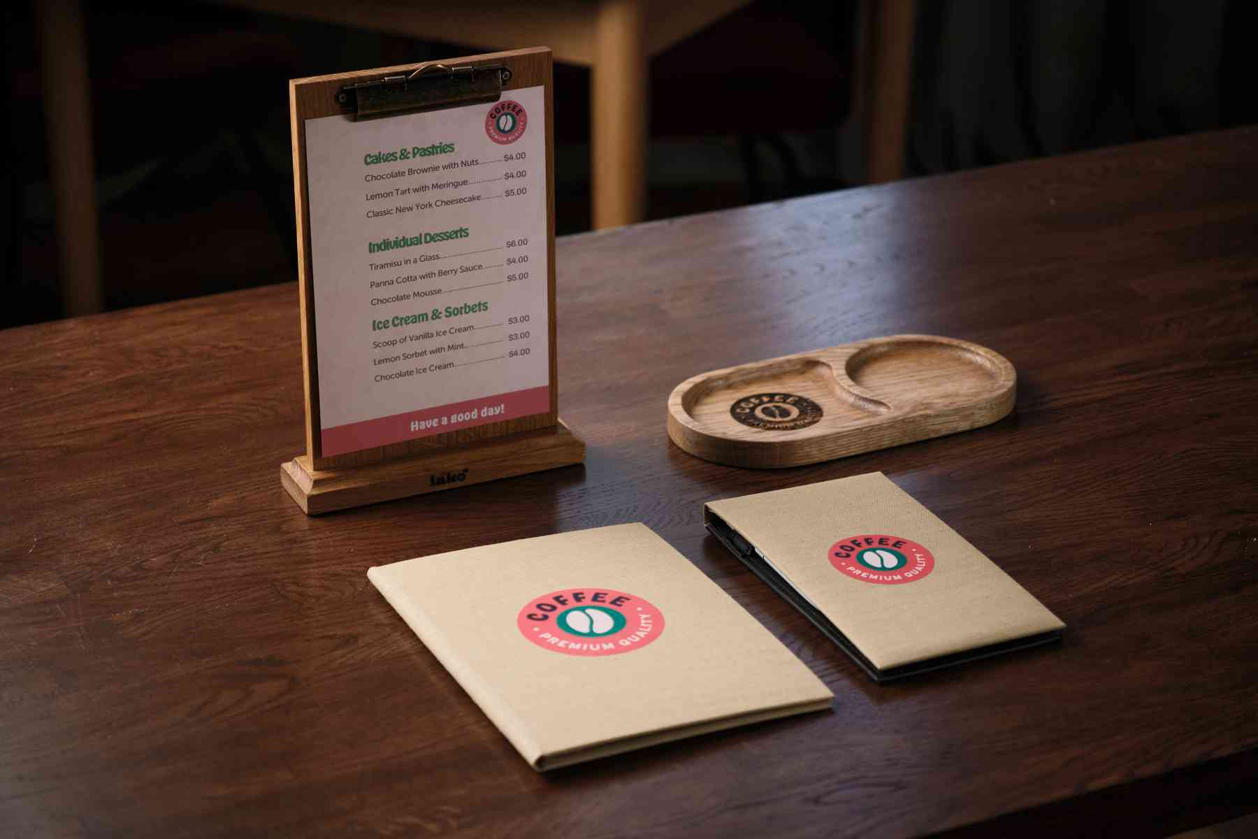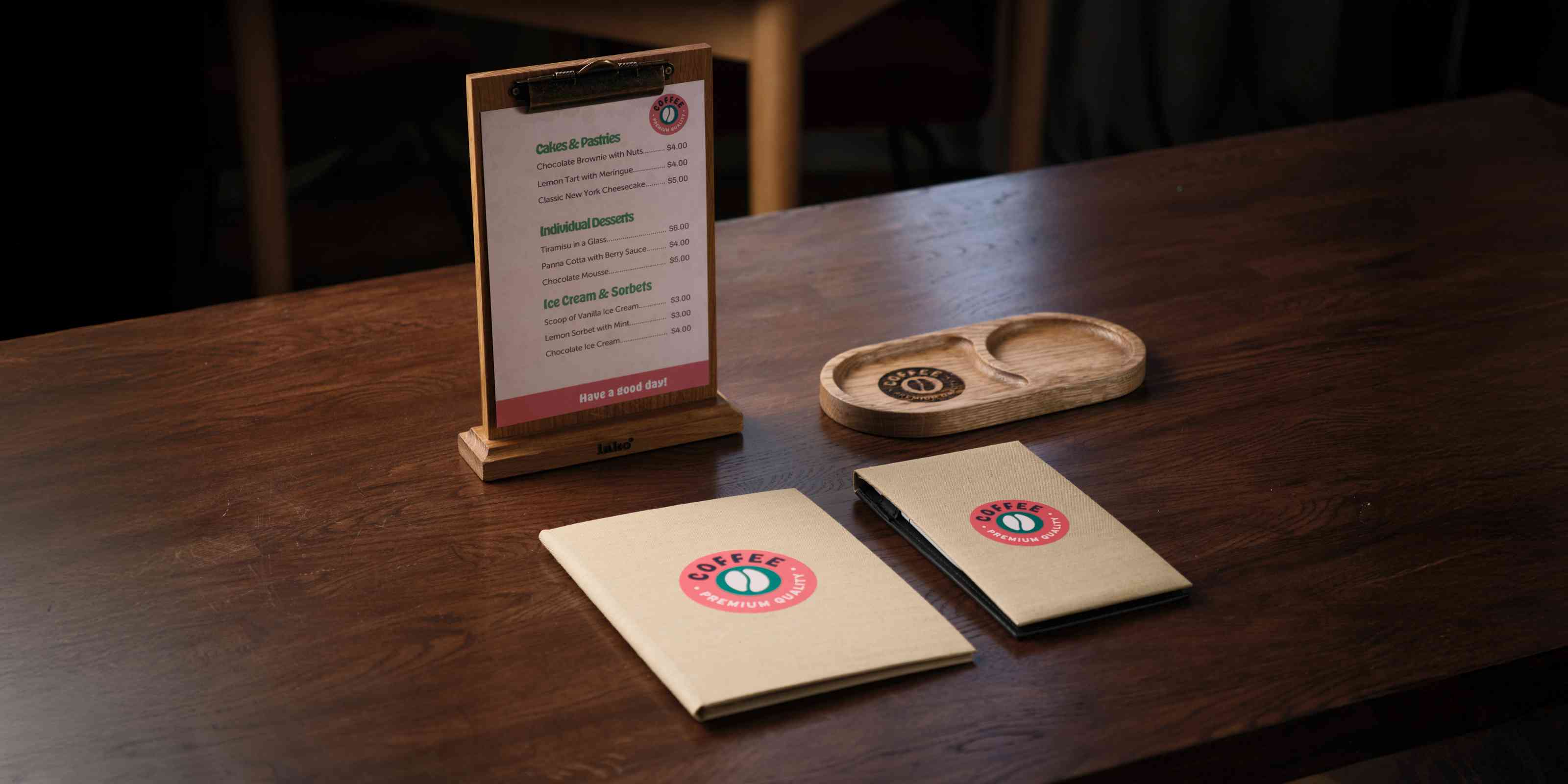 The Coffee Collection by Inko Horeca brings together modern, eco-friendly essentials designed for stylish coffee shops, tea rooms, and boutique cafés. Featuring a soft fabric menu cover, an elegant brass-bound table stand, a customizable wood tray, and a durable fabric notebook for staff, this curated set blends functionality with natural charm. Perfect for creating a warm, cohesive look while elevating the guest experience.