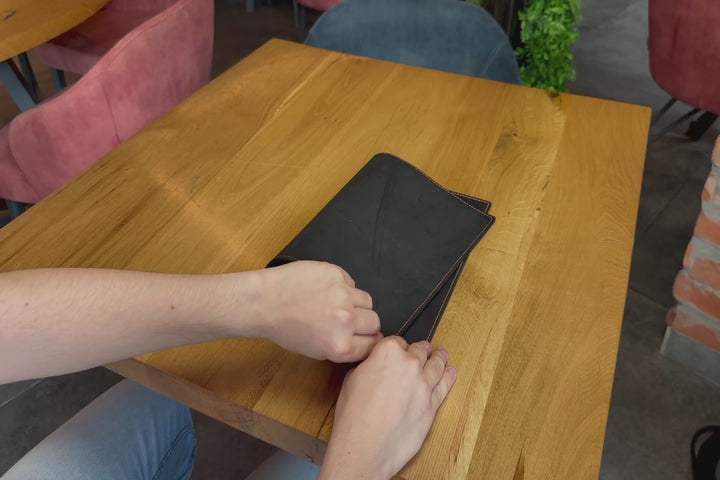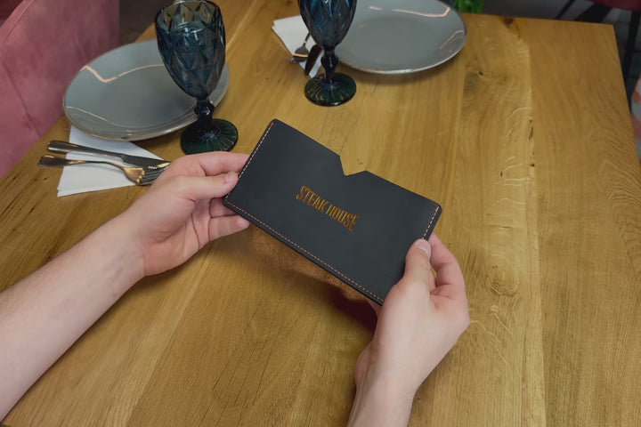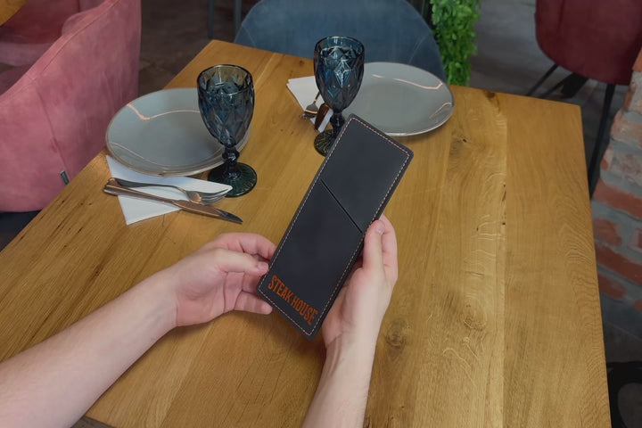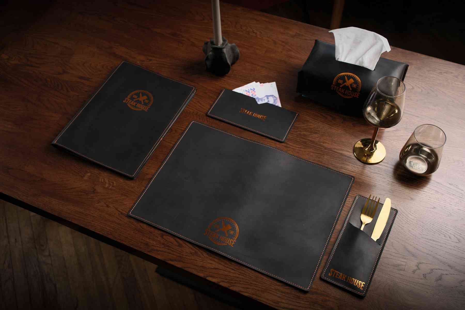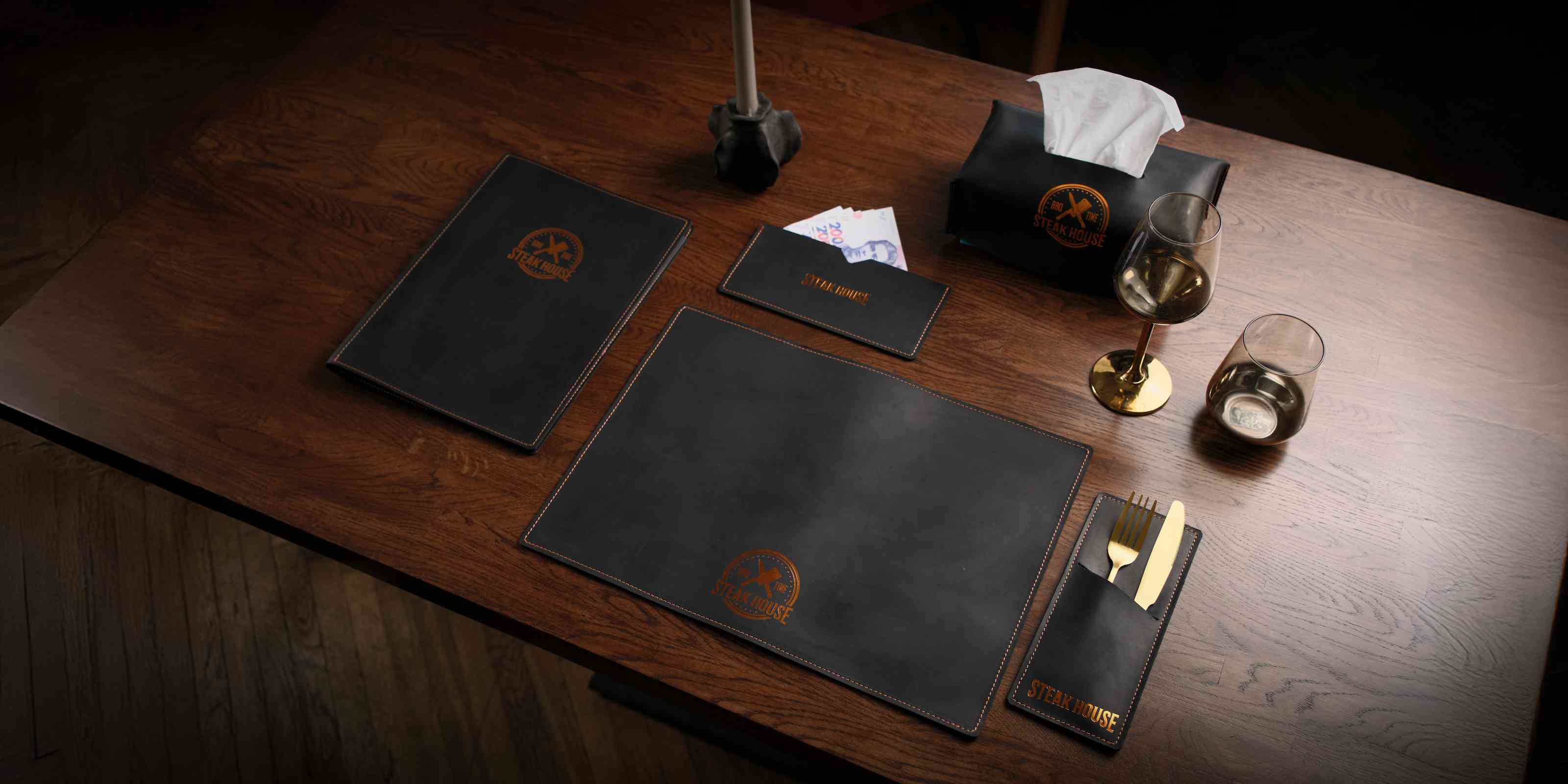 A premium range of leather accessories designed for upscale dining. Crafted from Dark Crazy Horse leather with elegant copper debossing and stitching, this collection includes menu covers, check presenters, placemats, and cutlery holders—each piece combining durability with timeless style for a refined steakhouse experience.