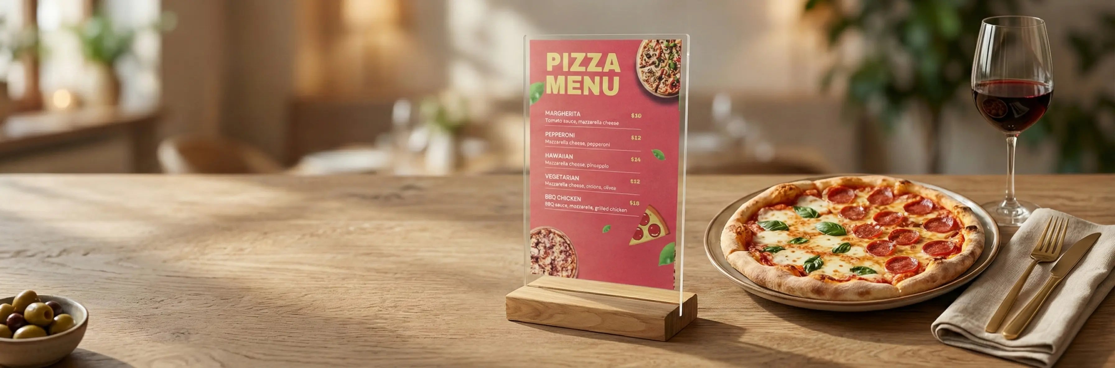 Table stands are compact display holders placed directly on tables, counters or bars to present menus, promotional offers, QR codes, reservation signs, or guest information. They help your venue deliver messages clearly to guests without needing wall space or bulky displays.
