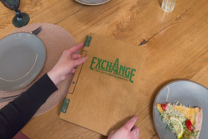 Custom Wooden Menu with Green Engraving and Green Leather (M02A2-G)